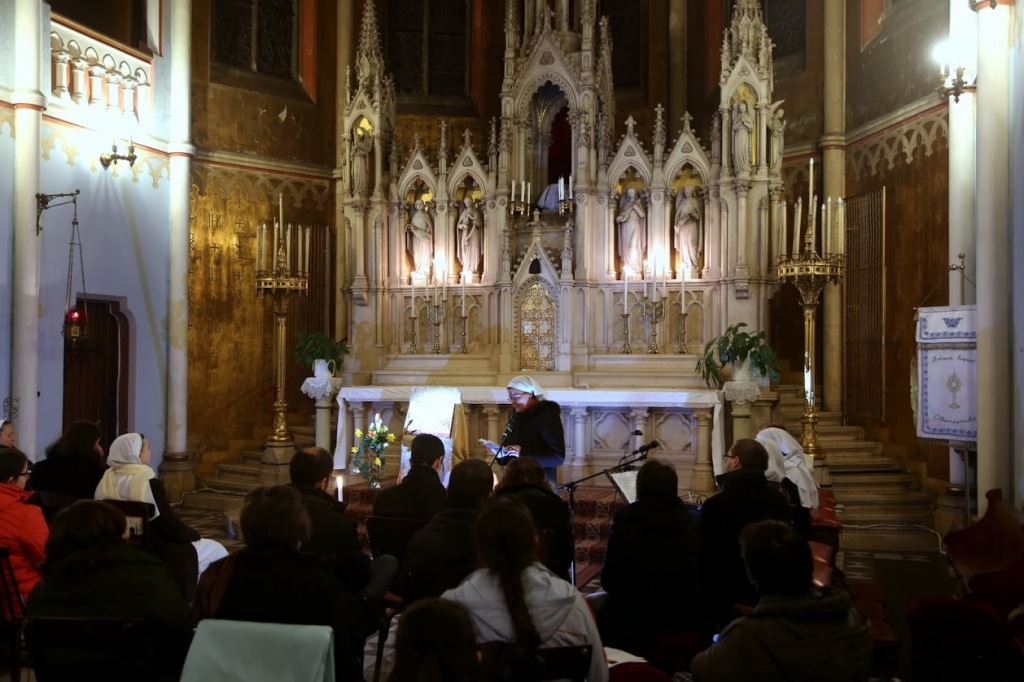 A szertartást a sztichirákkal, a bizánci szertartásban a föltámadási evangéliumokhoz tartozó énekekkel és ugyancsak bizánci dallamú prokimennel (a szentírási olvasmányok előtt énekelt zsoltárvers) vezették be, majd az imádság a János-evangélium nyomán elmélkedéssel folytatódott. Versegi Beáta Mária nővér szavai a Jézust és tanítványait fogadó betániai házba vezettek be: „Húsvét előtt hat nappal járunk. Lázár otthonában minden ideális: Lázár, Márta és Mária ott vannak a tanítványokkal érkező Jézussal. Mindenki megtalálta a szerepét. Mária előveszi a drága olajat, és megkeni vele Jézust. 300 dénár az értéke, ahogy a méltatlankodók állítják, ami akkoriban egy munkás éves fizetését jelentette. Ott van Lázár, aki feltámadt, és Jézus, aki a halálra készül. Mennyit ér az élet? Mennyit a halál? A botránkozó Júdás és Jézus válasza az élet és halál drámájába visz be bennünket. Ez az odaadás és önmagunk visszatartásának a drámája. Ha merünk nagylelkűek lenni, ha készek vagyunk megfeledkezni érdekeinkről, nagyszerű dolog történik velünk: átlépünk a halálból az életre.”