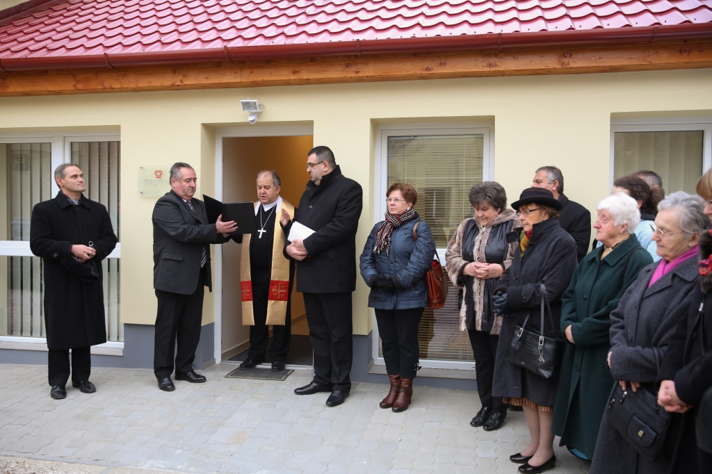 Megérkezik Bábel Balázs érsek. Mindannyian összegyűlünk a hideg-rideg udvaron, de csak néhány pillanatra, hogy a rövid üdvözlés és ima után szimbolikusan birtokba vegyük a házat, amely mostantól mindenkit nyitott ajtóval vár. „Urunk, áldd meg a munkatársakat, akik tanácstalan vagy csapások áldozataivá vált emberekért próbálnak tenni” – imádkozza az érsek, majd megáldja az intézményt és a Szentháromság-ikont. Nem sokkal később pedig rövid beszédet mond. Főként arról a nagy felismerésről beszél, amely a gyógyítás történetében az ember testi-lelki egységére vonatkozott, és arról a nagy-nagy reménységről, amelyet hitünk részeként testi feltámadásunkba vetünk. A reményről, amelyre minden embernek mindennap szüksége van, és amihez sokszor egymást kell hozzásegítenünk. Végül az egyház szociális tanítására tér ki, és arra, hogy az egyházi szociális intézmények mennyi szakértelmet, energiát vetnek latba a didergő világ érdekében.