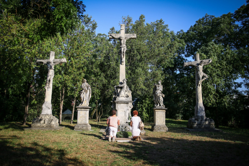 Még álltak a gyóntatófülkék előtt a sorok, mikor öt órakor elkezdődött a közeli, a város egyik ma is álló bástyáján épült kálvárián a keresztút. A bástya magaslatán a három 1770-es években állított kereszt körül, a „szent circuluson”, körjáraton helyezték el az 1920-as években közadakozásból, az oltáregylet kezdeményezésére a stációkat.