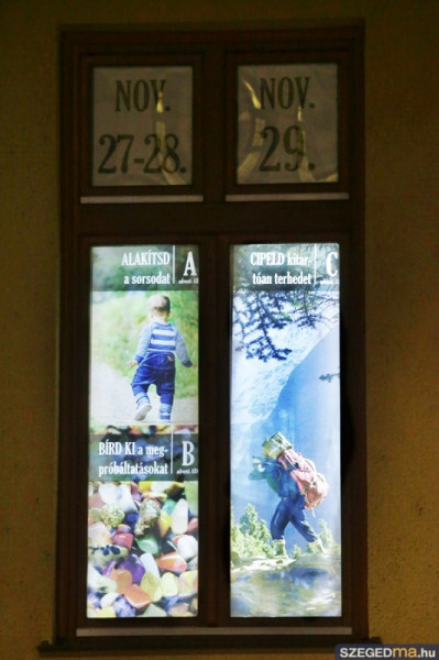„Cipeld kitartóan a terhedet!” – ez volt a szegedi „Adventi ábécé” üzenete november 29-én, amikor a cserkészek Dugonics téri bemutatója után felgyúlt az ünnepi fény a Katolikus Ház második ablakában is.