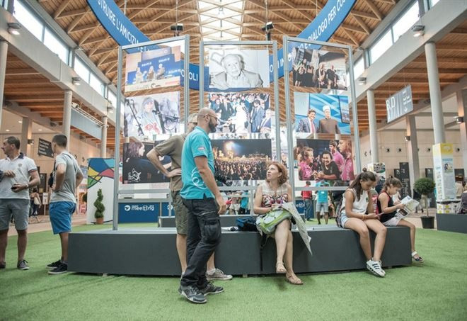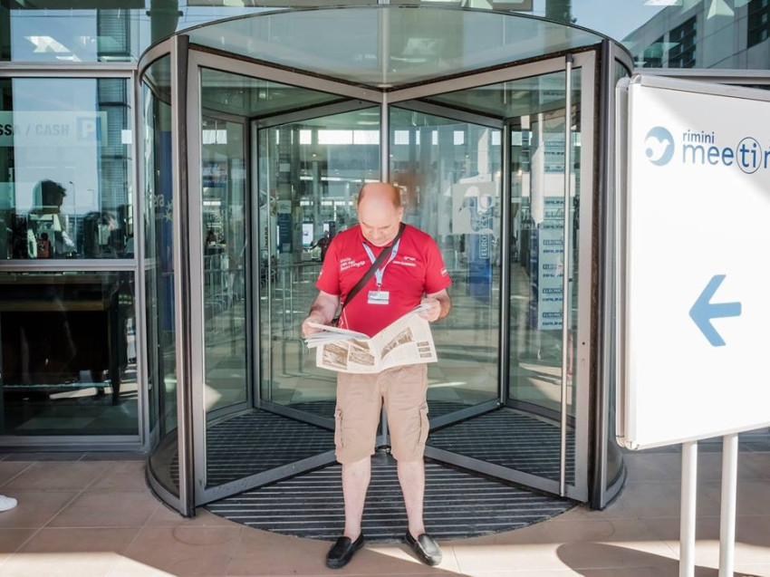 A Rimini Meetingen közel 3000 önkéntes dolgozik 16 nemzetből. Ők maguk fizetik utazásukat, szállásukat, de még étkezésüket is, a fél napi munka mellett részt vesznek a programokon. A legmesszebbről érkezett önkéntes Peruból érkezett a egyhetes rendezvényere, amelyről sokat hallott. De ami minden elképzelését felülmúlja, az az, hogy itt olyan szeretettel fogadták, úgy ölelték át, ahogyan az apja. Bár csak kávét főz, szendvicseket készít, de élete legszebb élménye a találkozón való részvétel. Itt mindenkinek feladata, felelőssége van, olyan, mint egy nagy gépezet. Mindenki nélkülözhetetlen és ez adja azt a gazdagságot, amiben itt részesülhettem – mondja.