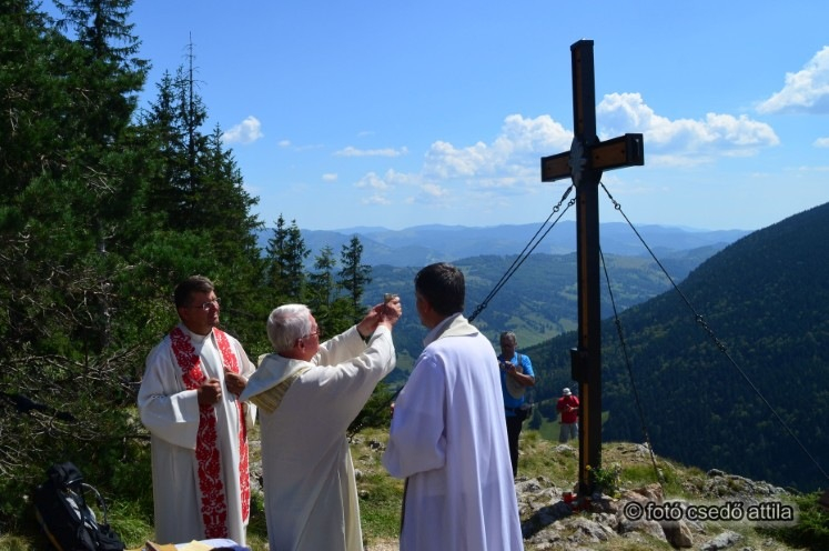 Miért állítanak keresztet? – tette fel a kérdést a szentbeszédben Korzenszky Richárd. – Jelként. A kereszt jel. Jelképekkel van tele az életünk. Az emberséghez hozzátartozik az, hogy olyasmit is tesz, aminek látszólag semmi értelme. Fölállítjuk ide a keresztet, ahol esetleg belecsap a villám. Fölösleges. Nem lesz ebből semmiféle idegenforgalmi haszon. De vonzereje lesz, azt mondják majd: „menjünk akkor már föl, ha ott van”. És sokan nem egyszerűen kíváncsiságból fognak feljönni, hanem azért, hogy elgondolkodjanak azon, „az én életemből sem hiányzik a kereszt”. Mindannyian, akik itt vagyunk, valamilyen formában kereszthordozók vagyunk, egymás terhét hordozzuk. Jézus adott példát erre.