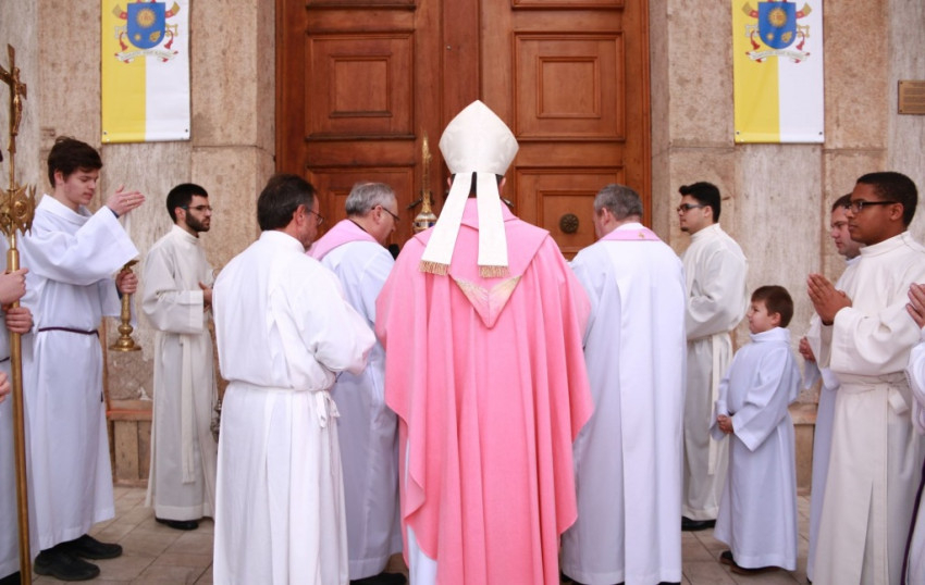 A püspök ezt követően imádkozott, majd megnyitotta a kaput, és bevonult az oltárhoz, ahol megkezdte a vasárnapi szentmisét.