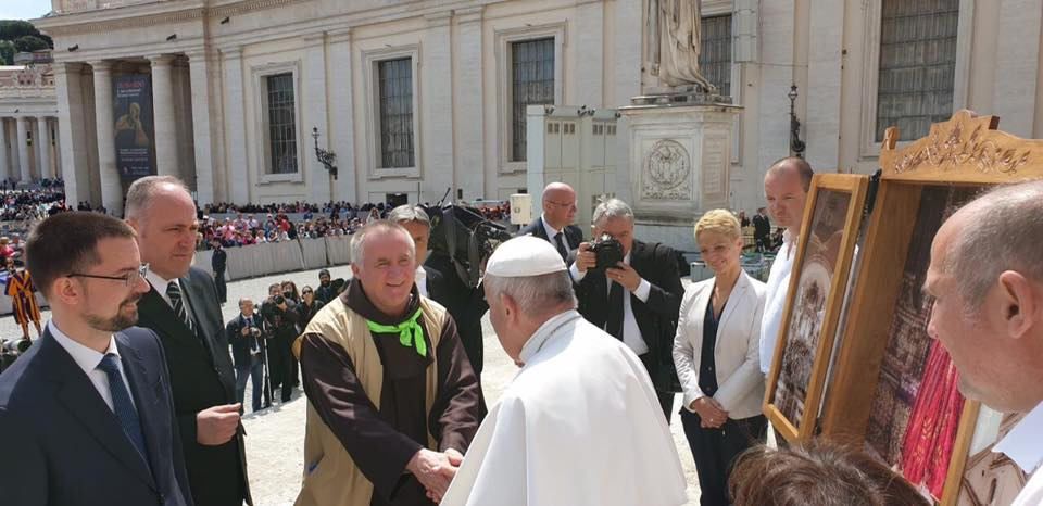 A katekézis után Ferenc pápa köszöntötte a különféle zarándokcsoportokat. A pápa ezután a kihallgatáson részt vevő bíborosok és püspökök személyes köszöntését fogadta, majd a kiemelt vendégek csoportjában találkozott Böjte Csaba testvérrel és azzal a kórussal, melynek tagjai Csaba testvér otthonaiban élő gyermekek. A harminctagú gyermekkórus énekkel köszöntötte a Szentatyát, majd átadták neki ajándékukat, egy hagyományos erdélyi ablakot (jellegzetes erdélyi ablak szárnyasoltárrá átalakítva – a szerk.), amelynek egyik szárnyán az alapítvány által gondozott gyerekek vannak, közepén a gyermek Jézus képe kirakva az alapítvány befogadóotthonaiban gondozott kétezer gyermek fotójából, a másik szárnyon a dévai Nagyboldogasszony ferences plébániatemplom látható. Csaba testvér pedig arra kérte Ferenc pápát, hogy tegye június elsejét a Gyermek Jézus szép ünnepnapjává.