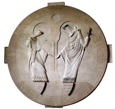 Boldog Gizella (984? - 1065) alakja a koronázási paláston, kezében a székesfehérvári királyi bazilika modellje (Magyar Nemzeti Múzeum)