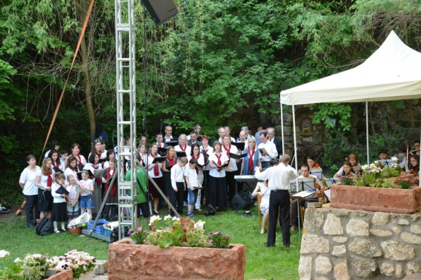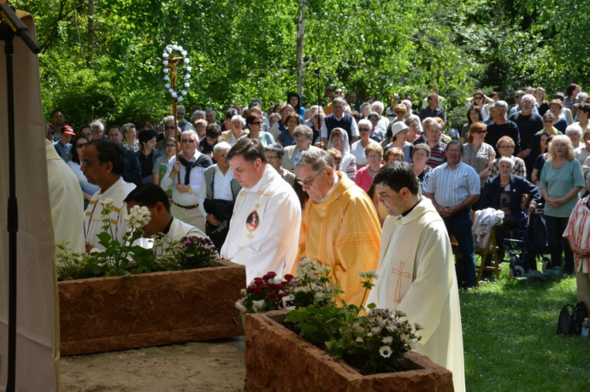 erdei tisztáson levő lourdes-i barlangnál a Dauner János szalézi atya