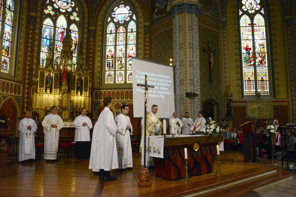 Alberto Bottari de Castello érsek, magyarországi apostoli nuncius nem tudott megjelenni az eseményen, ezért Császár István, a Szombathelyi Egyházmegye egyházmegyei kormányzója mutatta be az ünnepi szentmisét, többek között Harangozó Vilmos plébános koncelebrálásával. Császár István a Rózsafüzér Királynőjének ünnepe alkalmából a szentolvasót helyezte szentbeszédének középpontjába. Az egyházmegyei kormányzó rámutatott arra, hogy a rosarium „nem más, mint Krisztus arcának szemlélése Máriával”. Homíliájában nem feledkezett meg a domonkos rend alapítójáról, a spanyol származású nagy prédikátorról, Guzmán Szent Domonkosról, aki a szentolvasó által kívánta megtanítani a háború és a nyomor miatt reményüket és hitüket vesztett embereket „az igaz hit ábécéjére”. Szent Domonkos lelkiségének örökösei, a domonkos nővérek különleges meghívást kaptak arra, hogy Mária iskolájában szemléljék Krisztus arcát. Ez a kiválasztottság pedig azzal a feladattal jár, hogy a szemlélődésbe bevezessék a rájuk bízott fiatalokat és családjaikat. Császár István Szent II. János Pál pápát idézve felhívta a figyelmet a családban és a családért végzett imádság szükségességére. Hiszen az imádság segít a megbocsátásban, abban, hogy a családtagok kölcsönös szolidaritásban tudjanak élni. A szentbeszédet Császár István egy I. János Pál pápáról szóló történettel zárta, aki még rövid pontifikátusa előtt, velencei pátriárkaként, egy kórházban tett látogatás alkalmával egy elkeseredett, beteg asszonnyal találkozott. Az asszony sírva fakadt, mert úgy érezte, földi élete végéhez közeledik, és ő nem találja a mennyország kulcsát. Ezekre a szavakra a velencei pátriárka átnyújtotta számára a rózsafüzérét: „Íme, itt van a mennyország kulcsa.” Császár István arra biztatott, hogy „ezt a kulcsot vegyük kezünkbe, s adjuk tovább egymás kezébe!”