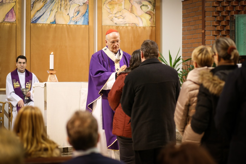 Erdő Péter bíboros a szentmise elején külön köszöntötte az AVE-kurzus szervezőit és résztvevőit, megköszönve az Emmánuel Közösség áldozatos munkáját. A liturgia során a főpásztor megáldotta az oltár mögött elhelyezett textilképeket, melyek szárnyasoltárként díszítik mostantól a templom belső terét.