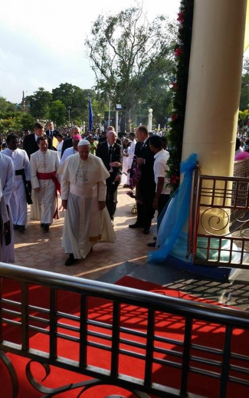 A pápát a mannari püspök fogadta a kegyhelyen. A Szentatya a szentély bejáratánál leszállt nyitott autójáról, hogy a hívekkel találkozhasson. Az angol, szingaléz és tamil nyelvű szertartáson Szűz Máriához imádkoztak a harmincéves konfliktus után 2009-ben kötött béke megszilárdításáért. Tamil és szingaléz családok is jelen voltak, akiket súlyosan érintett az ellenségeskedés. Az imák és a pápa beszéde után a Szentatya megáldotta az egybegyűlteket a Madhui Miasszonyunk szobrával. A szertartás végén Ferenc pápa szabadon engedett egy fehér békegalambot.