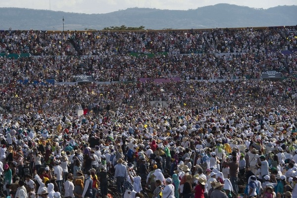 Az Úr ma is hív, egybehív benneteket, ahogyan az indián Juan Diegót hívta. Arra hív, hogy építsetek szentélyt. Szentélyt, amely nem egy fizikai tér, hanem egy közösség; szentélyt, amelyet plébániának hívnak; szentélyt, amelyet nemzetnek hívnak. A közösség, a család, az érzés, hogy egy ország állampolgára vagy – ezek a legfontosabb ellenszerek mindaz ellen, ami fenyeget bennünket, mert ezek megéreztetik velünk, hogy Isten e nagy családja részei vagyunk. Nem azért, hogy elmeneküljünk, bezárkózzunk, hanem éppen azért, hogy kilépjünk és hívjunk másokat is, kilépjünk és hirdessük mindenkinek, hogy Mexikóban fiatalnak lenni a legnagyobb gazdagság, és éppen ezért nem szabad feláldozni.