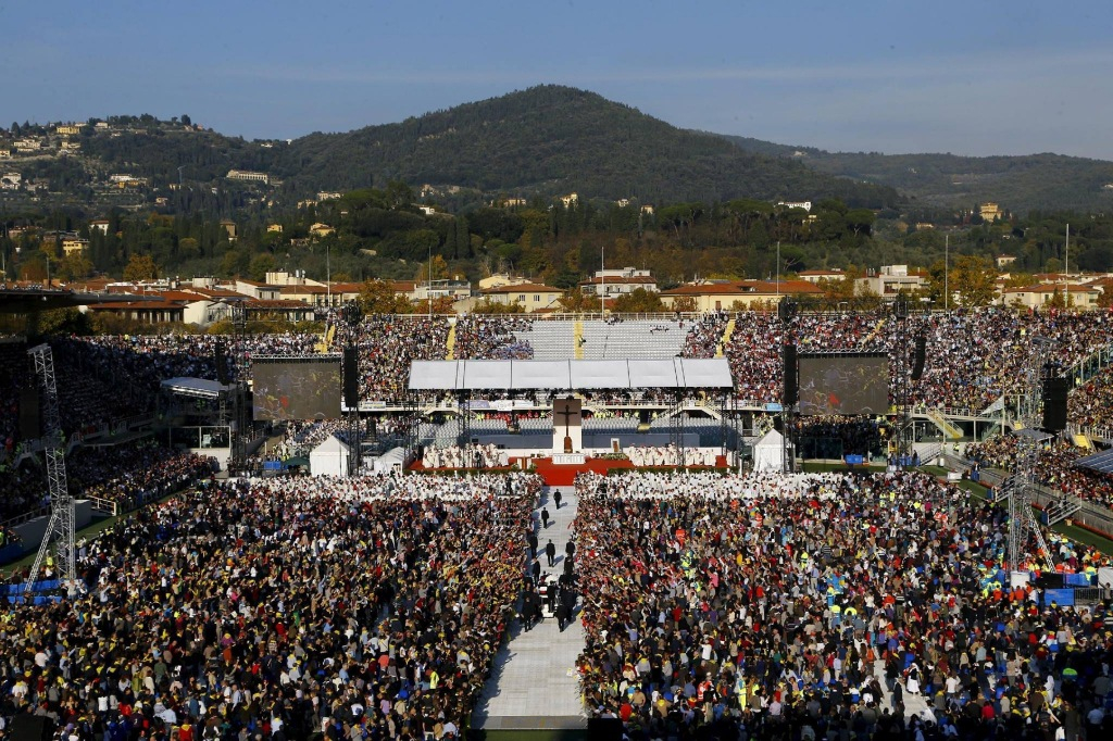 Isten és ember nem két szembenálló szélsőség, hanem öröktől fogva keresik egymást, mert az Isten felismeri saját képét az emberben, az ember pedig önmagára ismer, ha az Istenre néz. Ezt az igazságot ismerte fel Nagy Szent Leó pápa is: az igazi bölcsesség Krisztus kötelékében és az egyház szolgálatában áll. A humanizmus, melynek nagy tanúja éppen Firenze, a legkreatívabb pillanataiban mindig felöltötte a karitász, a szolgáló szeretet arcát” – zárta a firenzei stadionban tartott szentmise homíliáját Ferenc pápa.