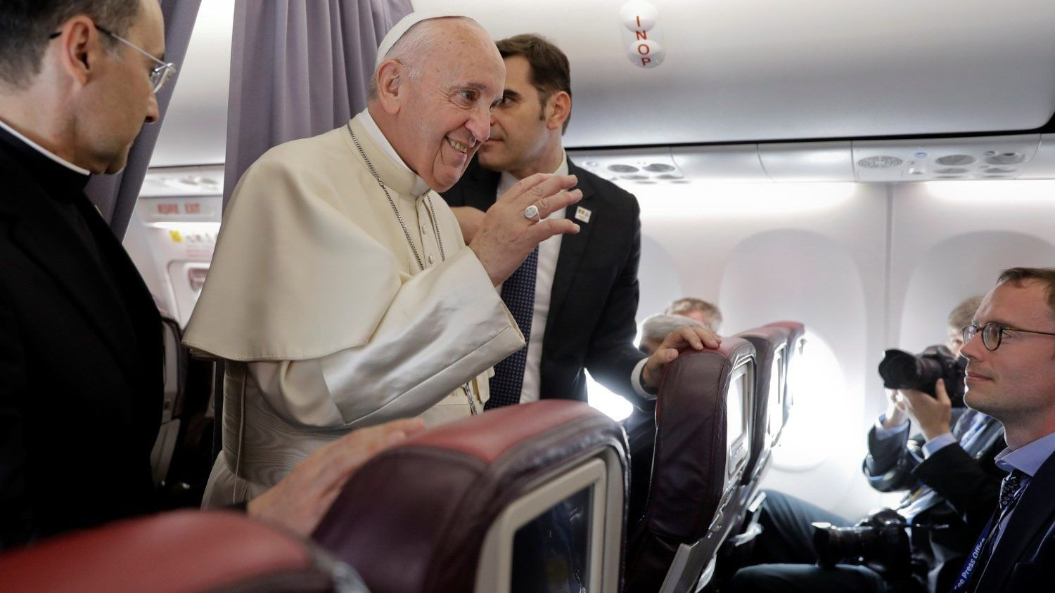 – Jó estét kívánok! Üdvözöljük körünkben, Szentatya, üdvözöllek benneteket! Visszaút… Szentatya, ennek az utazásnak a mottója „Járjunk együtt” volt, de az is, hogy „repüljünk együtt”, mert azt hiszem, tényleg sokat repültünk, és sokat dolgoztunk, fáradoztunk… Néhány nappal ezelőtt, a külföldi sajtó munkatársaihoz intézett beszédének vége felé azt mondta: „Apostoli útjaim során tudatosíthatom, milyen sok fáradsággal jár munkátok.” Most megmutatkozik a kollégáknak a fáradozása, szenvedélye, elkötelezett munkája, akik tudósítottak erről az utazásról… Ma van a tömegkommunikáció világnapja, tehát, mint tudjátok, a nekünk, újságíróknak, tömegkommunikációs munkatársaknak szentelt nap, melynek témája: „Egymás tagjai vagyunk.” Szentatya, tudom, hogy a kérdések előtt szeretne röviden szólni hozzánk erről a nekünk szentelt világnapról.