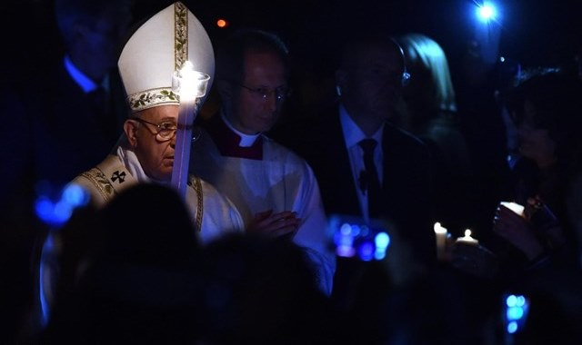 Péterhez és az asszonyokhoz hasonlóan mi sem találhatjuk meg az életet, ha szomorúak, reménytelenek maradunk, ha önmagunkba zárkózunk. Nyissuk meg az Úr előtt lepecsételt sírjainkat – mindannyian tudjuk, melyek ezek –, hogy Jézus belépjen és életet adjon! Vigyük hozzá neheztelésünk köveit, múltunk terheit, gyengeségeink és elbukásaink sziklatömbjeit. Ő hozzánk akar lépni, mert szeretne kézen fogni minket, hogy kiszabadítson a szorongásból. De az első kő, amelyet a mai éjszaka el kell hengeríteni: a reménytelenség, amely magunkba zár minket. Az Úr mentsen ki minket ebből a szörnyű csapdából, abból, hogy remény nélküli keresztények legyünk, olyanok, akik úgy élnek, mintha az Úr nem támadt volna fel és az élet középpontjában problémáink állnának!