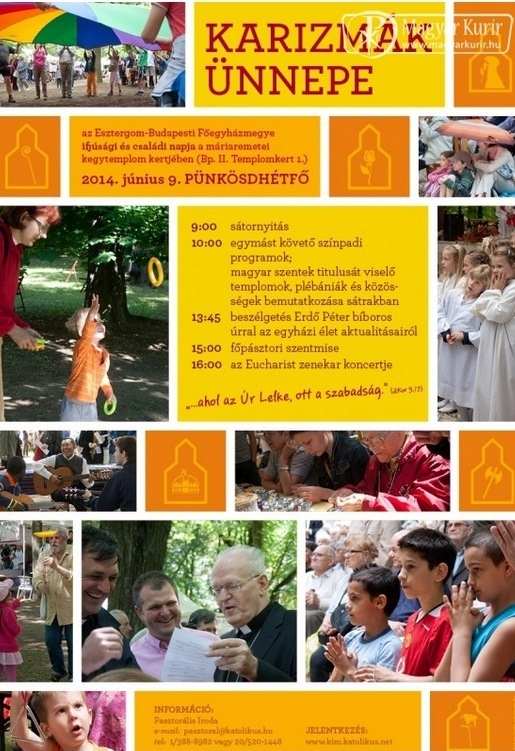 „Ahol az Úr lelke, ott a szabadság” mottóval rendezik meg pünkösdhétfőn a karizmák ünnepét Máriaremetén. Az Esztergom–Budapesti Főegyházmegye rendezvényén bemutatkoznak a főegyházmegye plébániái, családközösségei, katolikus intézmények, kiadók, illetve iskolák és a missziós tevékenységet végző közösségek.