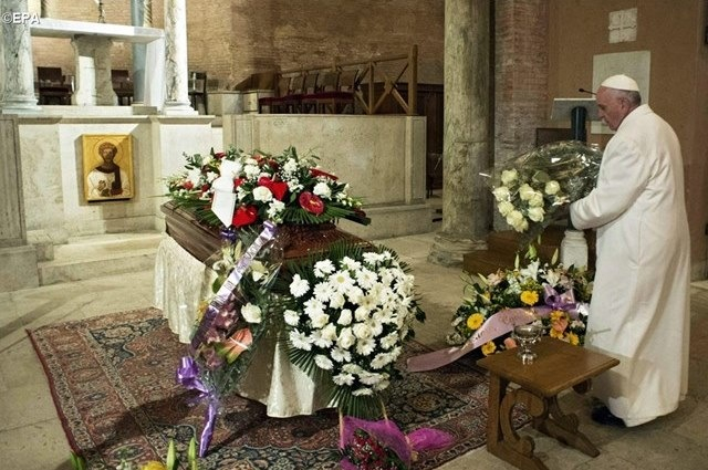 A pápa közel 20 percig csendes imába mélyedt a koporsó előtt és elhelyezett egy 12 fehér rózsából álló virágcsokrot – tájékoztat Federico Lombardi, szentszéki szóvivő.