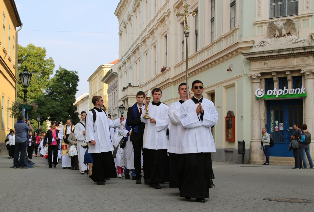 A gyülekező után most is a főutcán vonultak a bazilikába a résztvevők a találkozó nyitó szentmiséjére. A főcelebráns Bábel Balázs érsek szentbeszédében először a talákozó mottójául szolgáló mondat kapcsán aminiszter–minisztráns szó eredetéről beszélt.