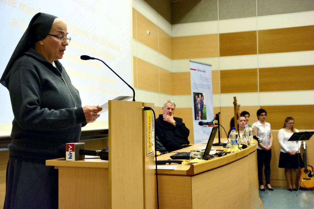 A szalézi család tagjai, szerzetesek, szerzetesnők, barátok, munkatársak jöttek el az ünnepi konferenciára. Elsőként Carolina Costabile nővér, a rend magyarországi elöljárója köszöntötte a konferencián megjelenteket.