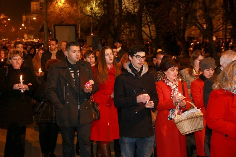 Nagyszombaton este tűzszenteléssel kezdődött a feltámadási vigília szertartás aa szatmárnémeti székesegyház főbejárata előtt. Schönberger Jenő püspök a megáldott tűzzel gyújtotta meg aztán a húsvéti gyertyát, amellyel jelenlevő papjai és ministránsai körében fél kilenckor bevonult a teljesen sötét templomba. A hívek ekkor már megtöltötték a padsorokat és sokan álltak is, úgy követték a szertartást. „Krisztus világossága!” – énekelte háromszor Barta Barnabás segédlelkész, amelyre a hívek minden alkalommal válaszoltak: „Istennek legyen hála!”
