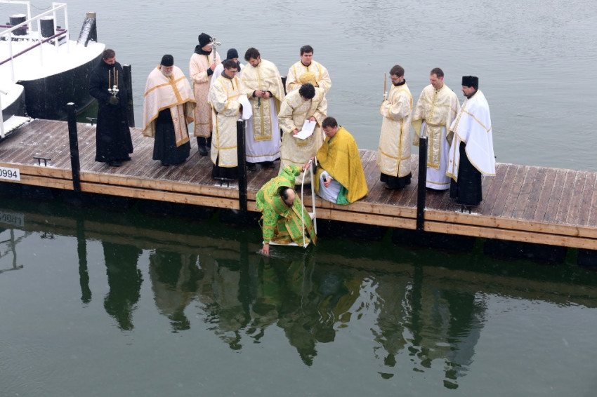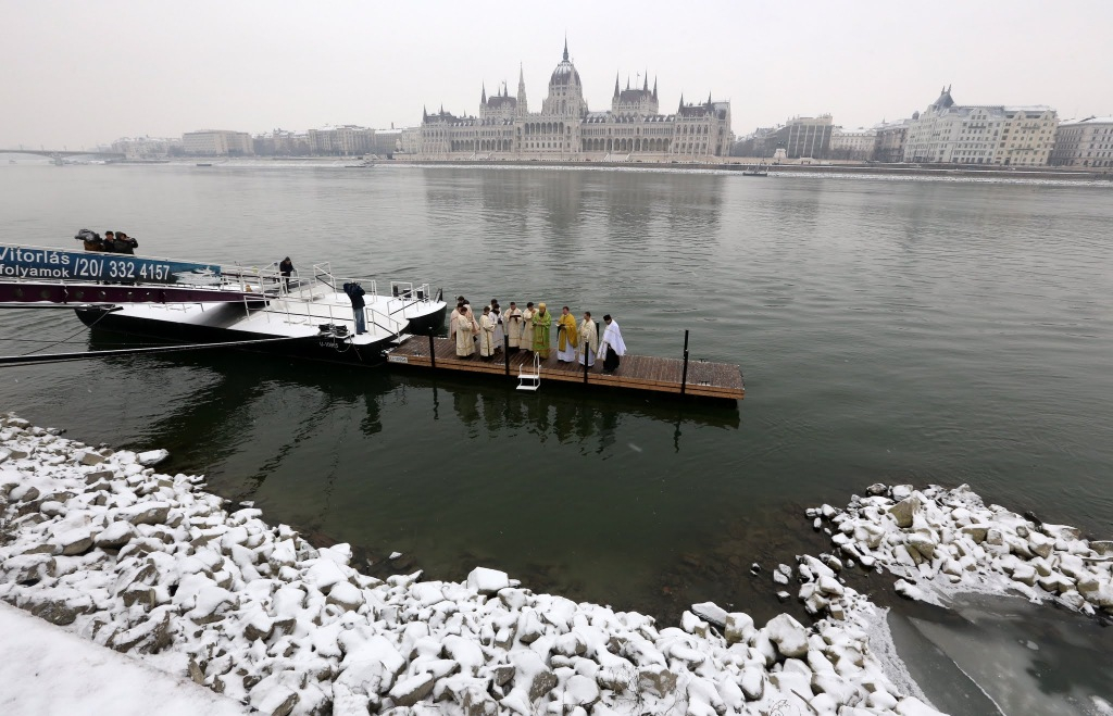 A templomot zsúfolásig megtöltő népes gyülekezet Kocsis Fülöp metropolita vezetésével vonult a Bem rakparton keresztül a Batthyány téri Duna-partra. A szűnni nem akaró hóesésben zengett az ének: „Az Úr szava a vizeken kiáltja, mondván: Jertek mindnyájan s vegyétek a megjelenő Krisztus lelkét.”