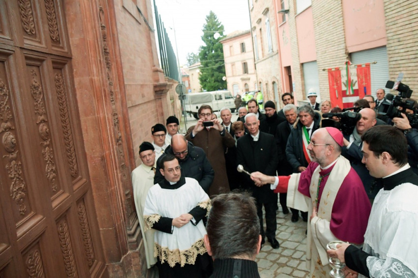 A Szent Szív- és Szent Benedek nemcsak az első templom, hanem az első középület, amely a földrengés után megnyitotta kapuit, Tolentinóban az összes többi templom zárva van még.