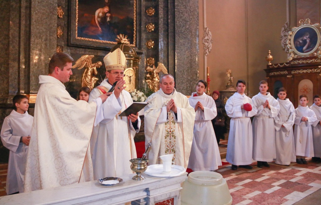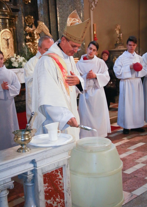 Vízkeresztkor régi hagyomány szerint a katolikus templomokban vizet szentelnek, amivel a papok meghintik a híveket, akik vesznek a vízből, és magukkal viszik otthonaikba. Schönberger Jenő püspök a bevonulást követően megáldotta a sót, amit a vízbe öntött. Megáldotta a vizet is, majd meghintette vele a híveket, a keresztségükre való emlékeztetésként.