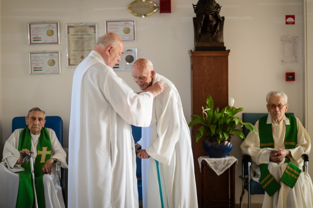Vasmisére igyekszünk Pilisvörösvárra. Generációk lelkivezetője, a 91 éves Futó Károly atya a Szent Erzsébet Otthonban mutatta be élete nagyjából 30 000. szentmiséjét. A kápolnát néhány vendég kivételével a ház lakói töltik meg. A kerekesszékek között alig találunk helyet. Csendes imában várakoznak, tekintetük az irgalmas Jézus-arcon, míg bevonul a vasmisés öt paptársával. Mindannyian a Manhertz Erzsébet SJC alapította otthon lakói.