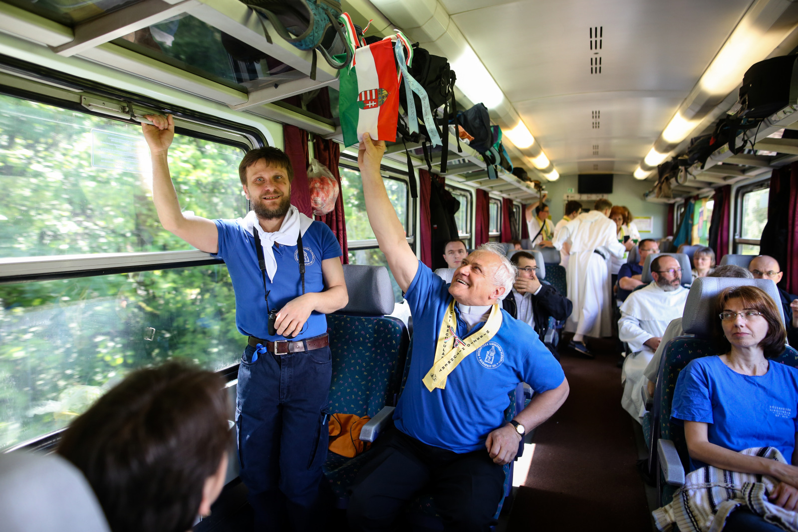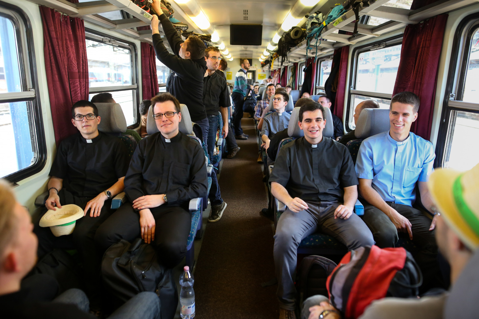 De nagyon előreszaladtunk, a fővárost elhagyva Miskolc felé tartunk. A vonatúton egymást követi az imádság, az elmélkedés és a beszélgetés. Csendes fülkék várják elmélkedésre és szentgyónásra a zarándokokat. Az esztergomi papnövendékek pápák írásaiból olvasnak fel. Közben sokszor felcsendül az ének Pálmai Árpád zarándokok számára összeállított énekesfüzetéből.