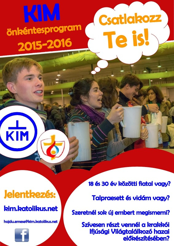 Önkéntesprogramot hirdet 2015 folyamán a Katolikus Ifjúsági Mozgalom abból a célból, hogy lehetőséget adjon fiatalok számára többek között a 2016-os krakkói ifjúsági világtalálkozó hazai előkészítésének folyamatában való részvételre. Az alábbiakban a KIM felhívását közöljük.