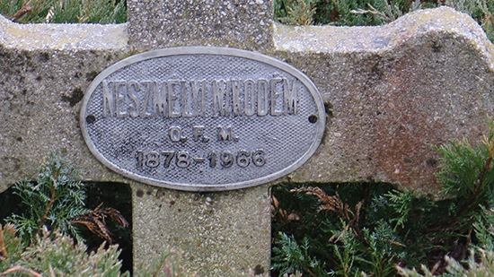 Fr. Neszmélyi János Nikodémus 1878-ban született Némethásoson (Vas vm). 1901-ben öltözött be és kezdte meg a noviciátust. 1902-ben tett egyszerű fogadalmat. 1902-ban Malackán, 1903-ban Pozsonyban szakács. 1905-ben tett örökfogadalmat. 1914-ben Szombathelyen, 1916-ban Szakolcán szakács, 1917-ben Malackán, 1919-ben Sümegen, 1920-ban Veszprémben, 1921-ben Sümegen, 1923-ban Szombathelyen, 1927-ben Budapesten szakács, 1929-ben Veszprémben és Kismartonban szakács, 1930-ban Németújváron szakács. 1944-ben Szombathelyen ebédlős. 1952-ben került Pannonhalmára, 1966-ban hunyt el.