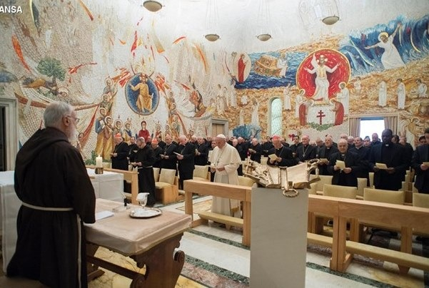 A kúria bíborosai, püspökei és papjai mellett jelen voltak a szerzetesrendek legfőbb elöljárói és helyetteseik is. A szónok e mostani sorozatában a Szentlélekről elmélkedik Igyuk a Lélek józan mámorát címmel, mely valójában Szent Ambrus püspök hajnali himnuszának egyik sora.