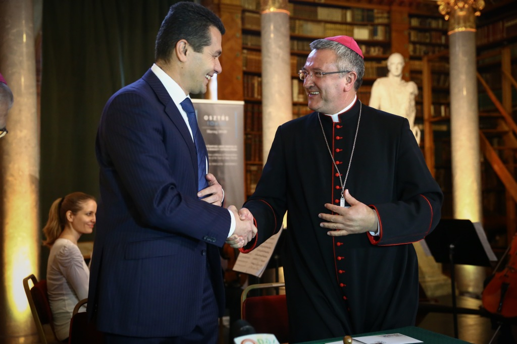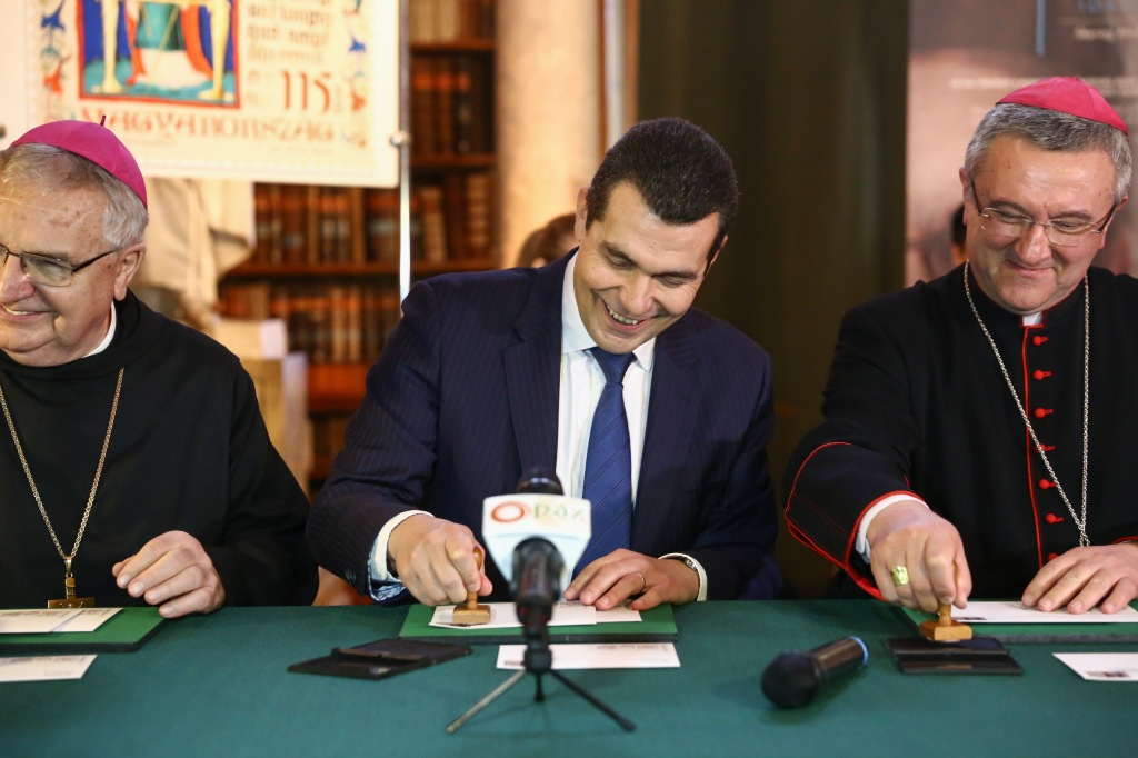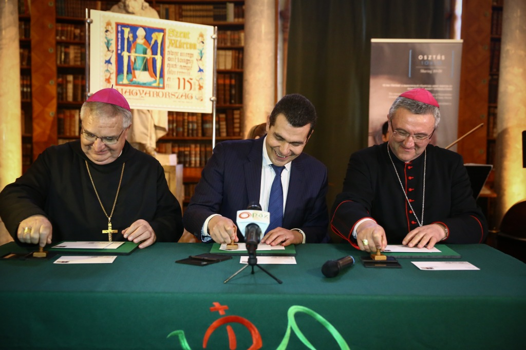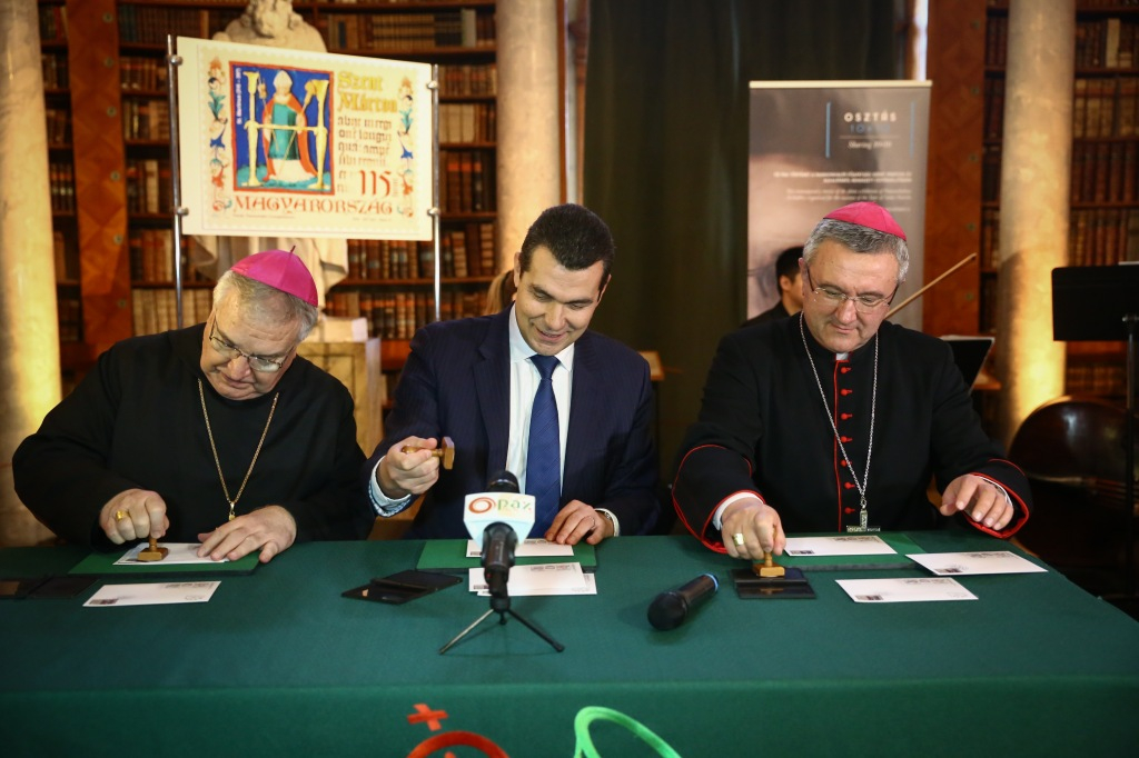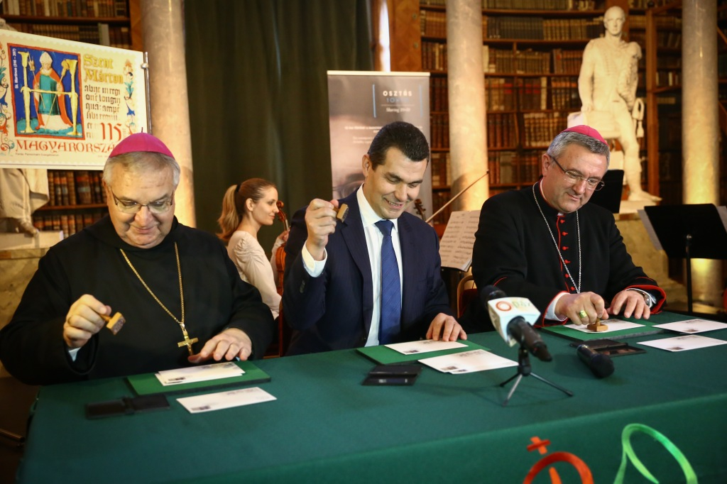 Kovács Zoltán szavai után következett az ünnepi bélyeg útjára bocsátása, amely során a Magyar Posta Zrt. vezérigazgató-helyettese, Veres András megyéspüspök és Várszegi Asztrik főapát pecséttel látták el az első megbélyegzett borítékokat.