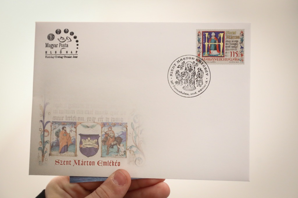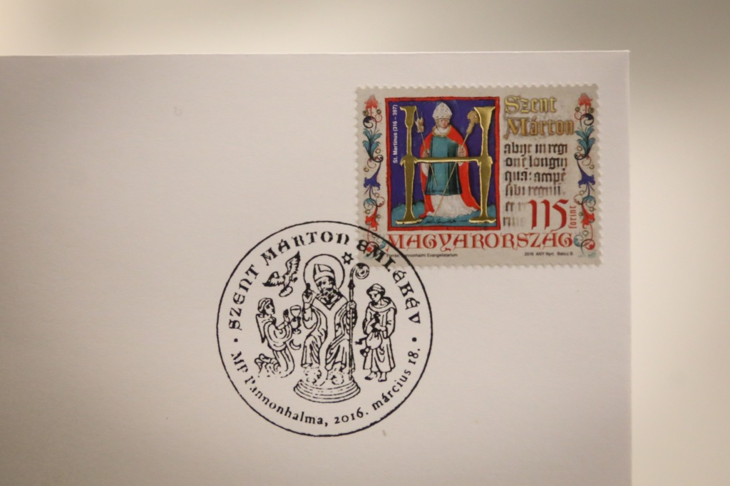Bevezetője után Kovács Zoltán, a Magyar Posta Zrt. vezérigazgató-helyettese mutatta be az ünnepi Szent Márton-bélyeget. Megmaradva a kulturális igazgató által felvetett szálnál, Kovács Zoltán, aki maga is pannonhalmi diák volt, az emlékév mottójára utalva kiemelte, hogy a mai digitalizált világban már nem küldünk egymásnak kézzel írt levelet. Ebben a közegben a bencések az írásbeliség őrzői – hangsúlyozta, majd utalt a főapát gazdag levelezésére is. A bélyeggel kapcsolatban elmondta, hogy a Pannonhalmán őrzöttEvangelistarium Szent Márton-ábrázolását használták föl, amelyen a kódex egy szövegrészlete is megjelenik. A bélyeg tervét Baticz András készítette.