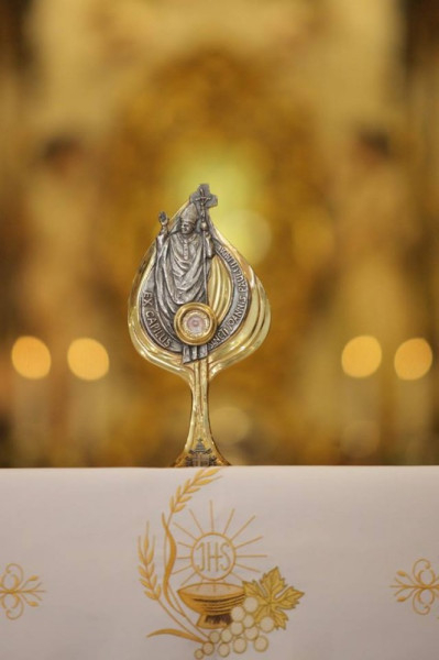 Mieczysław Mokrzycki lembergi érsek, a szent pápa másodtitkára adományozta a máriabesnyői kegyhelynek az ereklyét – II. János Pál hajszálait –, melyet az érsek nevében Rózsa László diakónus adott át. Emlékeztetett, az ereklyék tisztelete már az őskeresztényeknél kialakult, ugyanis az első vértanúk, az első szentek sírja fölé emelték a bazilikákat, ott miséztek, a szentek testéből vett ereklyéket pedig elhelyezték az oltárokban. Rózsa László elmondta azt is, személyesen ismeri Mieczysław Mokrzyckit, aki II. János Pál, majd XVI. Benedek titkára is volt, mielőtt kinevezték lembergi érsekké 2007-ben. Végül a diakónus átadta a hivatalos igazoló dokumentumot Stella Leontinnak.