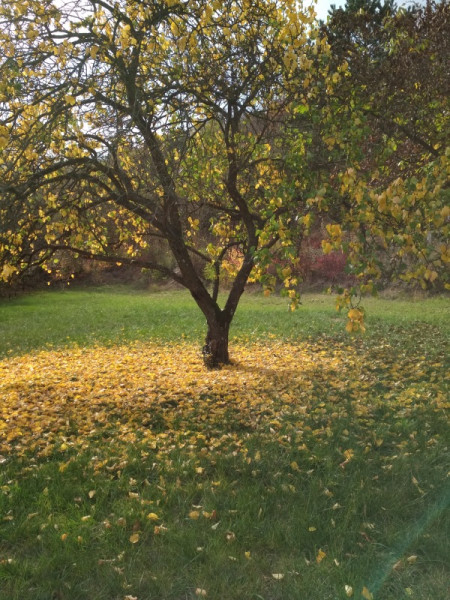 Csodálatos látvány egy idős gyümölcsfa lombhullás idején is. A sárgabarackfa pedig különösen szép. Ha csak az aranyló avartakarót tekintjük is, gondoljuk el, mennyi szén-dioxidot kötött meg a levegőből, mennyi szerves anyagot alkotott a levelek műhelyében az idén is ez a fa. Az ágak, a gyökerek is vastagodtak, élő szénraktárak a fás részek. És ezek még csak a klímavédelmi előnyök. Hulladékot nem hagyott maga után, hiszen az avar lassan újra humusszá bomlik, táplálva apró talajlakó organizmusok milliárdjait. Ami a jövendőhöz szükséges, már ott van a rügyekbe rejtve, hogy a következő évben tovább terebélyesedve újra kínáljon virágot, nektárt, érett gyümölcsöt, enyhe árnyékot az arra járóknak, alatta megpihenőknek. Hálával gondolhatunk elődeinkre, akik valamikor elültették, óvták, gondozták csemetekorában.