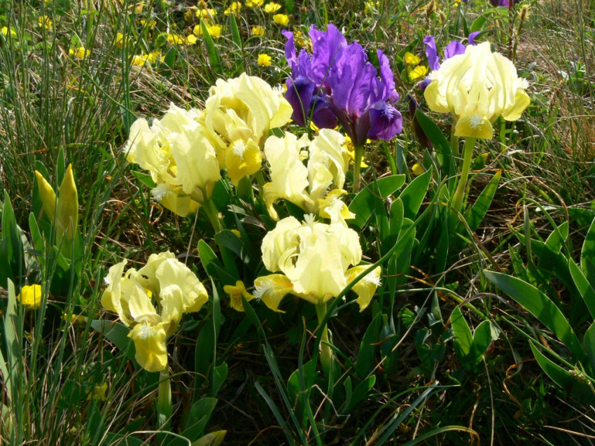 Ahol a lankásabb déli oldalon már kétujjnyi föld takarja a sziklát, ott kezdődik az apró, feltűnő szépségű törpeíriszek birodalma! Olyan sűrűn szövik össze gyöktörzseikkel a talajt, hogy itt már a legpusztítóbb szélnek, zápornak sincs esélye velük szemben. Ugyanaz a növény a csúcson csak néhány centi, de lejjebb, ahol vastagabb a termőréteg, akár arasznyira is megnőnek, ott már az árvalányhajmezőket színesítik. Különös, hogy egyszerre mindkét színben pompáznak, a lilák, sötétkékek ragyogó sárgákkal vegyesen nyílnak, valóban „Szinyei Merse ecsetjére valók”, ahogy Pénzes Antal botanikus jellemezte őket!