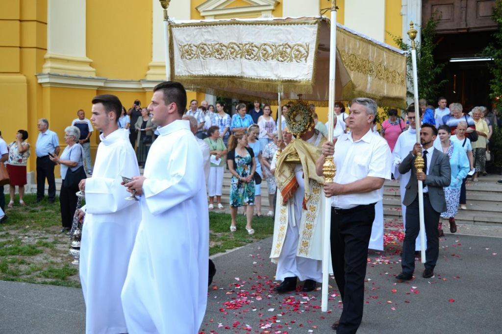 Nagybecskereken az úrnapi szentmisét Német László SVD megyéspüspök mutatta be a székesegyházban. A főpásztorral együtt misézett Gyuris László püspöki helynök, székesegyházi plébános, Tietze Jenő apostoli protonotárius, nyugalmazott székesegyházi plébános és Elias Ohoiledwarin SVD. Homíliát magyar nyelven a püspöki helynök, horvát nyelven a főpásztor mondott. A körmenetben, amelynek három stációja a püspökség és plébánia udvarában, a negyedik pedig a székesegyházban, az Isteni Irgalmasság kápolnájában volt, a felnőtt hívek mellett részt vettek a legkisebbek, akik virágszirmokat szórtak.
