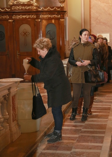 Schönberger Jenő az áldozatbemutatás elején asszisztenciájával a jobb oldali mellékoltárhoz vonult, ahol megáldotta az ott, edényben elhelyezett vizet, majd végigvonult a templomon és meghintette a híveket. A hívek már a szentmise alatt merítettek az edényben levő szenteltvízből (amely mint szentelmény, az isteni kegyelmek közvetítője), hogy aztán otthonaikba is elvigyék.