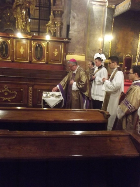Szentbeszédet követően a főpásztor megáldotta a tavalyi virágvasárnapi barkák hamvát, majd sor került a hamvazás szertartására.